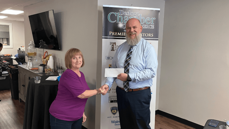 On behalf of the Desloge Chamber of Commerce, Joni Bannister presented a donation to Dr. Brandon Gregory, Superintendent of North St. Francois County Schools, to be used for the district's backpack program. The donation came from tips made at the 2025 Labor Day Picnic.